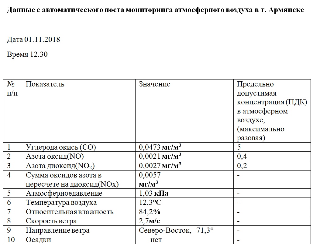 Главная / Информация / Данные с автоматического поста мониторинга атмосферного воздуха в г. Армянске 01.11.2018