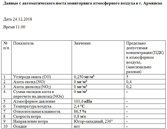 Главная / Информация / Данные с автоматического поста мониторинга атмосферного воздуха в г. Армянске Дата 24.12.2018