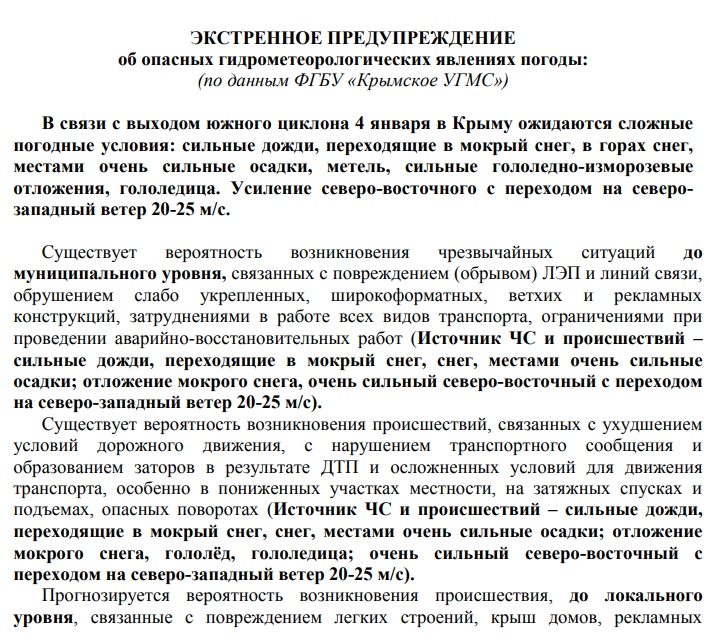 ЭКСТРЕННОЕ ПРЕДУПРЕЖДЕНИЕ об опасных гидрометеорологических явлениях погоды на 04.01.2019