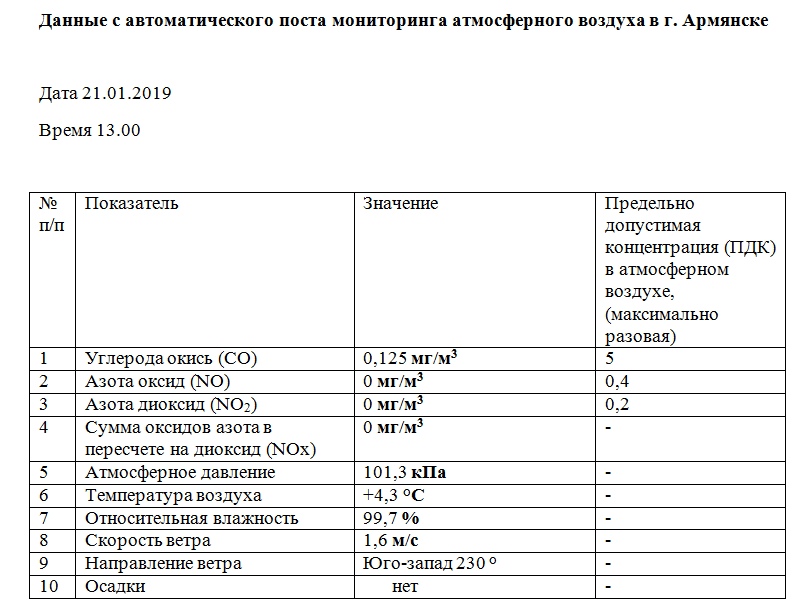 Главная / Информация / Данные с автоматического поста мониторинга атмосферного воздуха в г. Армянске Дата 21.01.2018