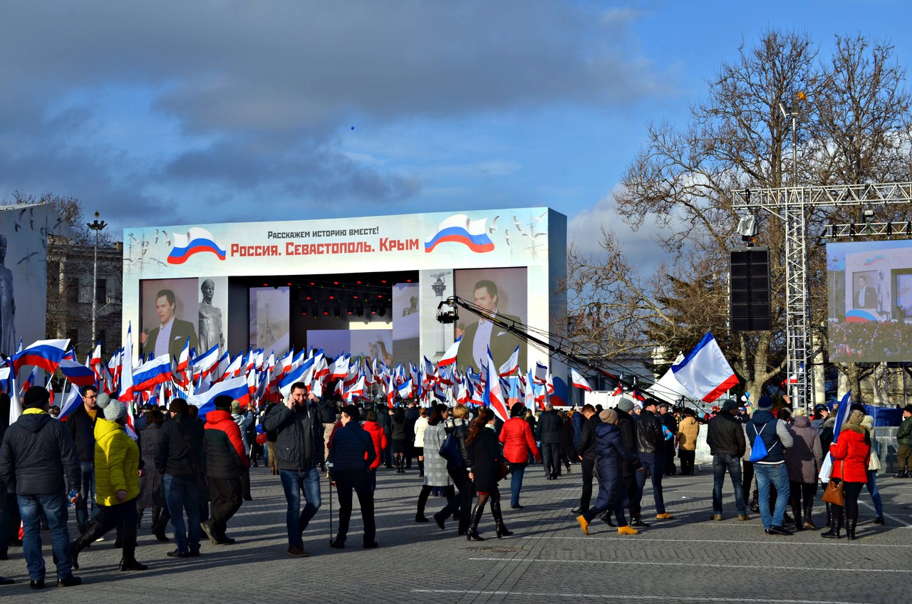 Время начала митинга 17 часов, но задолго до этого момента на площади Нахимова тясячи людей, в том числе и делегация из Армянска. В этот день перед крымчанами выступали лучшие артисты России. Сцена для Севастополя необычная привезли ее из Москвы, обычно эту концертную площадку устанавливают на Красной Площади - теперь в Севастополе. К назначенному времени вся площадь Нахимова заполнена людьми, в руках флаги России, Крыма.