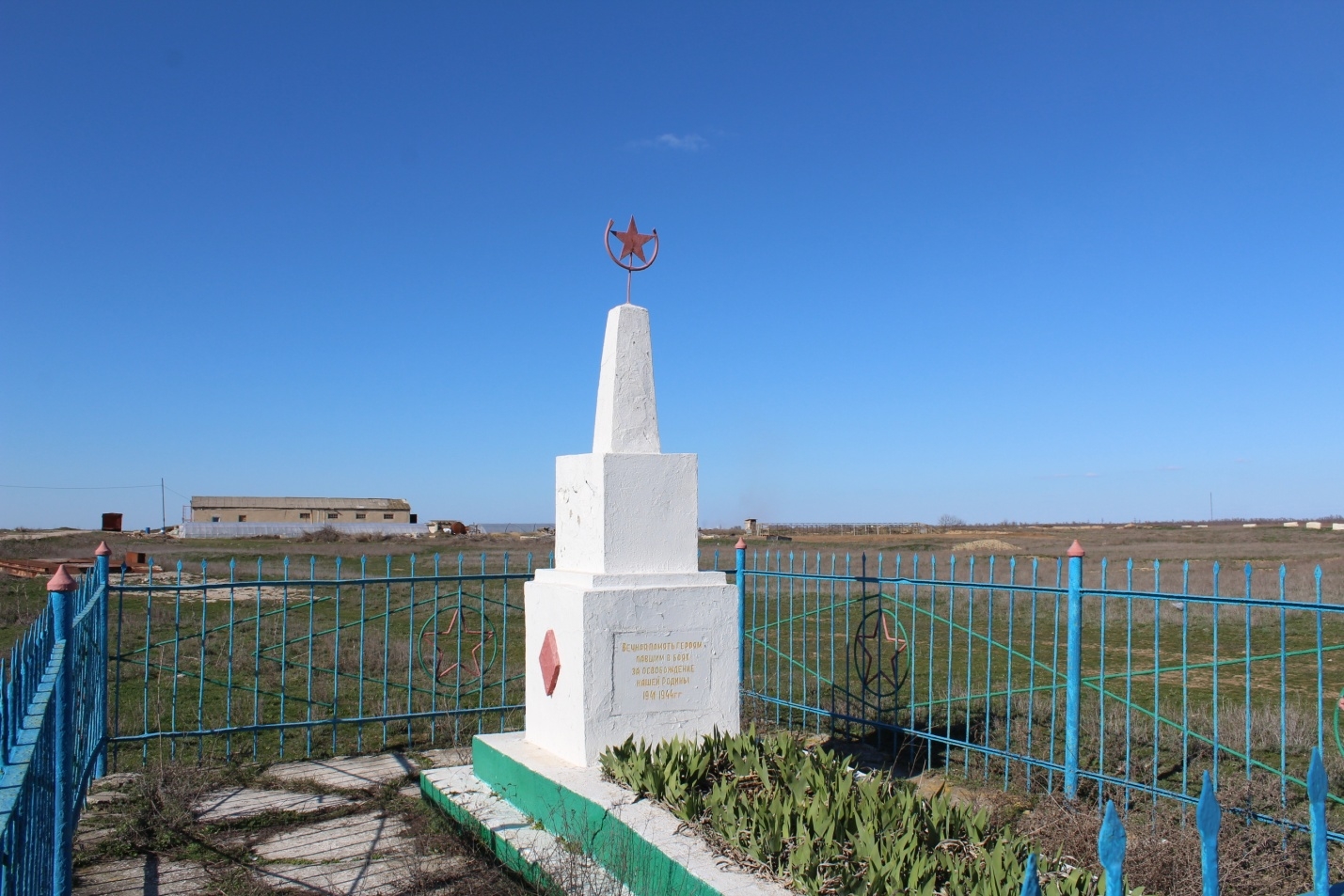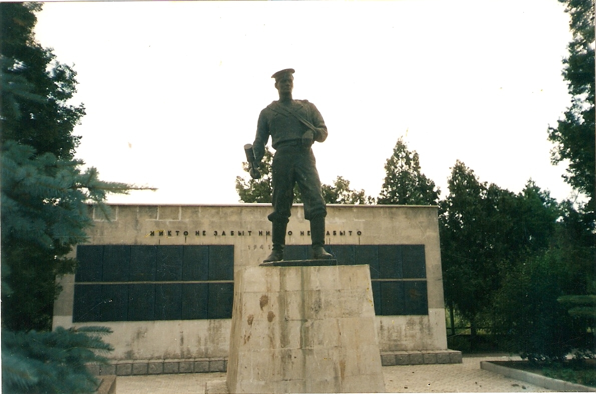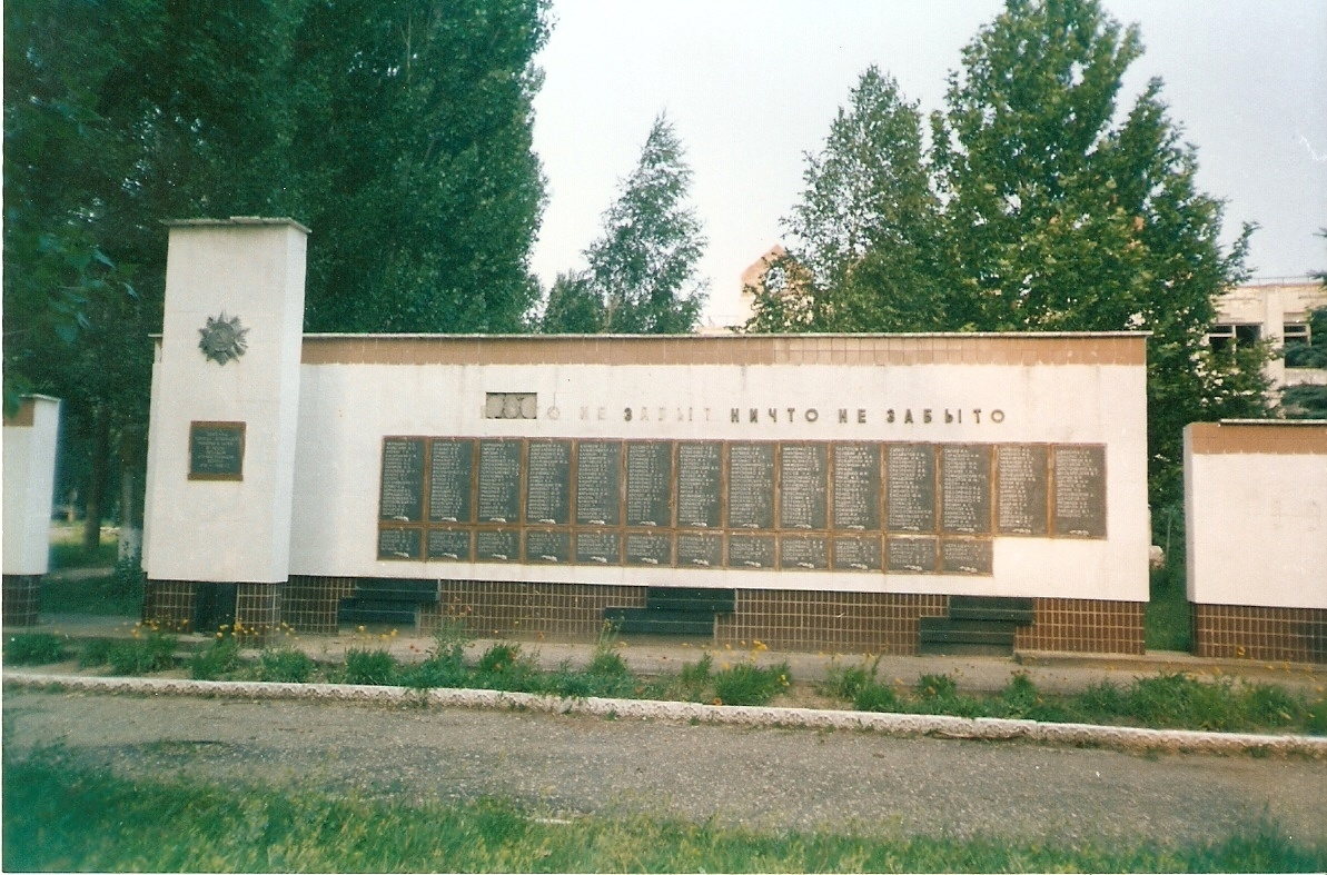 Первый в районе памятник героям Великой Отечественной войны был открыт 21 мая 1944 года. Он был воздвигнут военными строителями на гребне вала и представлял собой деревянный мавзолей, внутри которого находилось два ряда могил. На двух мраморных досках были высечены имена захороненных здесь воинов. Среди них – Герои Советского Союза М.Бакиров и И.Бережной, А.Кононенко, И.Бондарь, тело которого на лафете перевезли из Севастополя, где он погиб. По бокам мавзолея (высота 25 метров) стояли две башни. Аналогичные памятники были установлены в с.Ишунь и в Армянске.