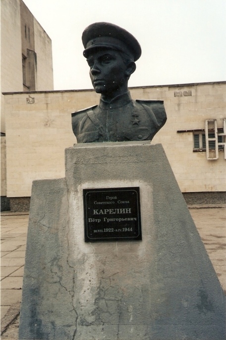 На том самом месте, где совершил бессмертный подвиг П.Г. Карелин, в 1975 году выросла экспериментальная средняя школа №3. По ходатайству местных властей и учащихся новой школы и по инициативе П.Г. Буренко рядом с ней установлен бюст Героя. 7 мая 1977 года этот памятник отважному офицеру был открыт.