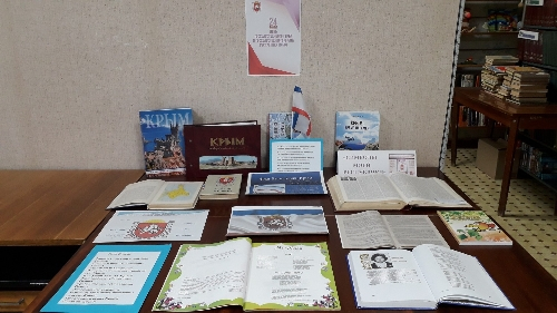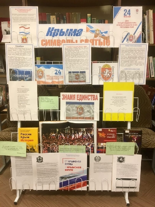 С целью укрепления единства, патриотизма и гражданственности в читальном зале Центральной городской библиотеки им.З.Левицкого организована тематическая выставка литературы «Крыма символы святые», где представлены издания, посвященные истории крымской символики, фотографии флагов и гербов Республики.