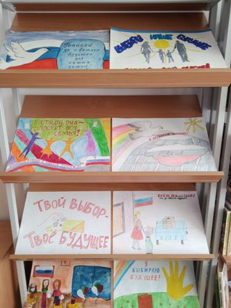 На выставке представлены 22 работы, на которых ребята отобразили свое видение избирательного процесса.